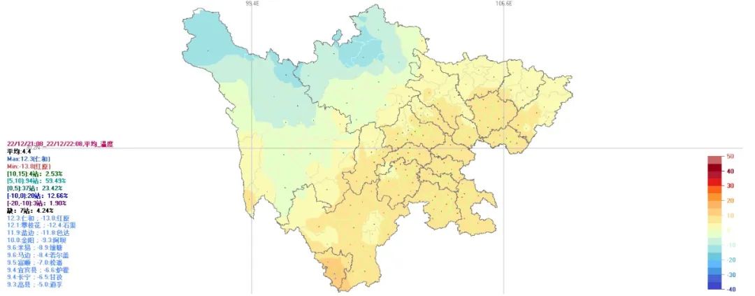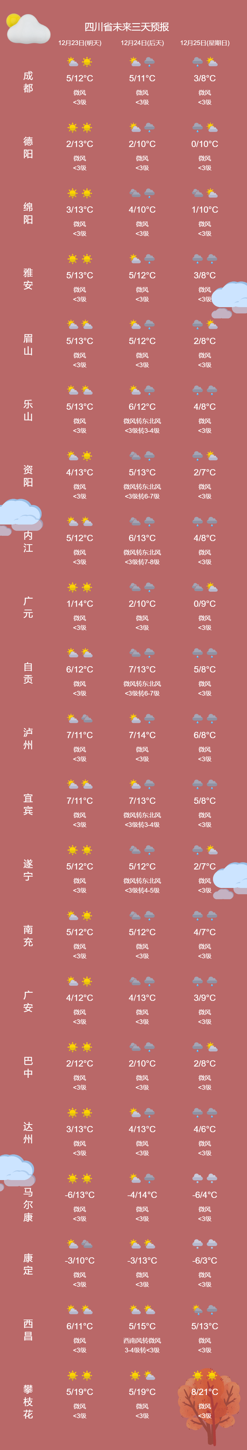 昨天08时到今天08时,盆地最低气温,北部沿山-2~1℃,其余地方1~3℃;最高气温12~15℃。