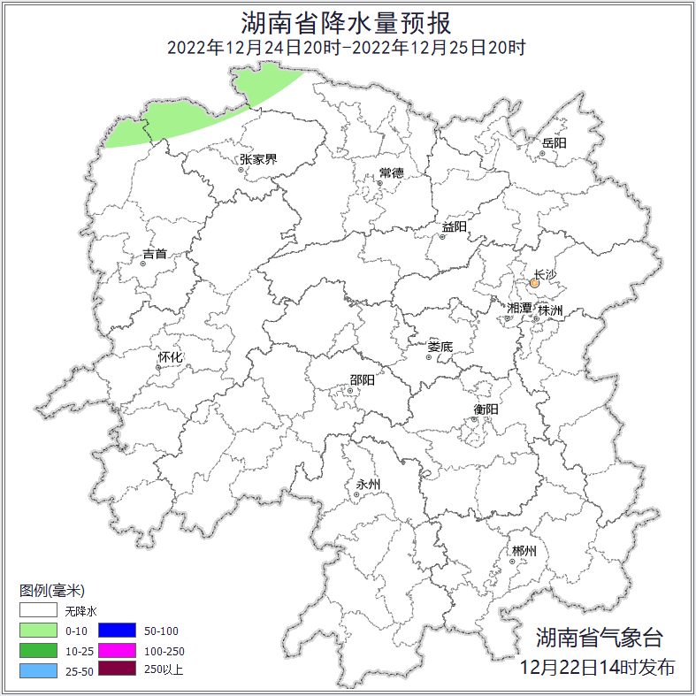 23日20时至24日20时,全省多云间晴天,北风2~3级;最高气温湘南14~16℃,其他地区12~14℃;最低气温湘北0~2℃,其他地区3~5℃。