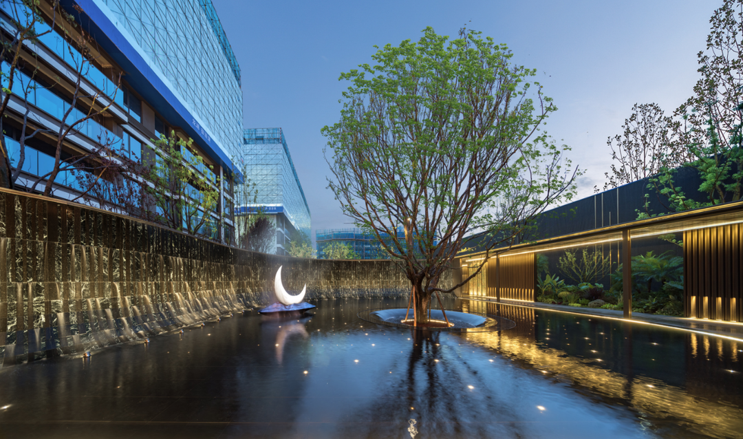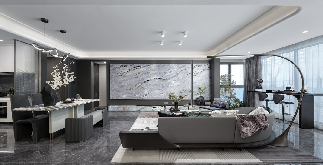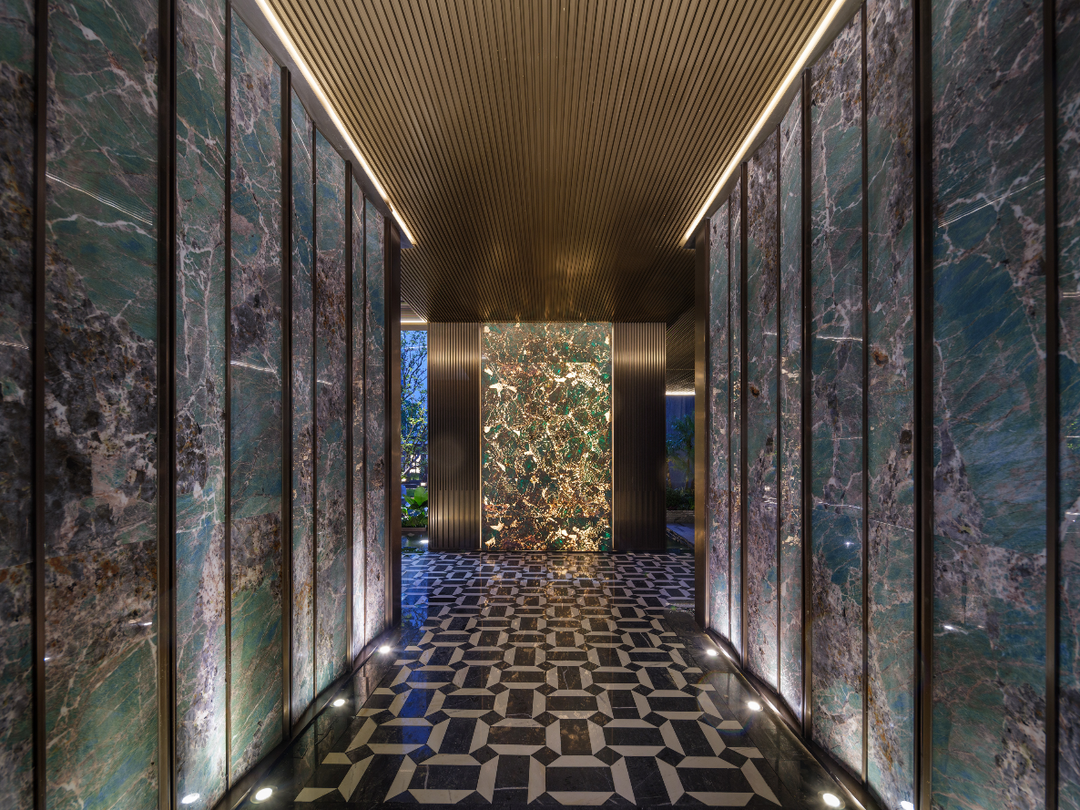 主入口黄金组合。近700㎡酒店式前场+中置景观环岛+约800㎡双层游艇会所,少见约250米风雨连廊,精选亚马逊绿石材作为连廊景墙,灯光背透与天然石材配合,质感甚至超过不少儫宅的室内装修,归家尽显满满高档社区既视感。