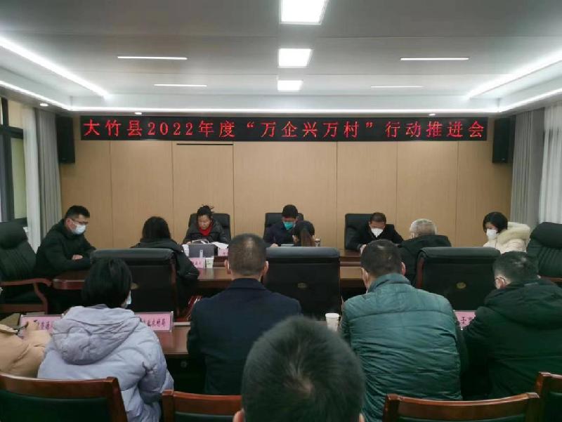 12月21日,大竹县组织召开2022年度“万企兴万村”行动推进会。大竹县委常委、统战部部长、总工会主席庞启来出席会议并讲话。大竹县“万企兴万村”行动领导小组成员单位负责同志和民营企业代表参加会议。会议以视频方式开至县级各相关部门(单位)、各乡镇(街道)。