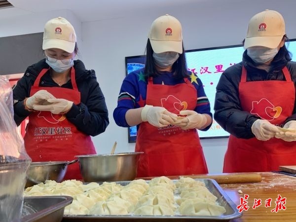 下午3时许,长江日报记者来到江汉里社区党群服务中心,看到数名居民志愿者、社区工作人员、社工以及吉年养老中心的工作人员正戴着手套、绑上围裙,在大长桌前忙活着。揉面、和馅、擀皮,大家分工有序,不一会便包完一大盘饺子,这里便是“暖冬·云上饺子节”的主会场。