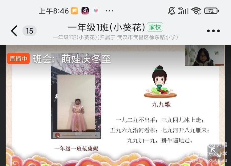 “一九二九不出手,三九四九冰上走……”《九九歌》以简单通俗的语言传达着自冬至日起气候的变化,体现着我国劳动人民的智慧。 复兴路小学、南湖一小、徐东路小学、万福林小学等学校的孩子伴随着手势舞朗诵着《九九歌》,在朗朗歌声中迎接冬至的到来。棋盘街小学的孩子们还化身为小小讲解员,向家人讲述着冬至节的来历和习俗。