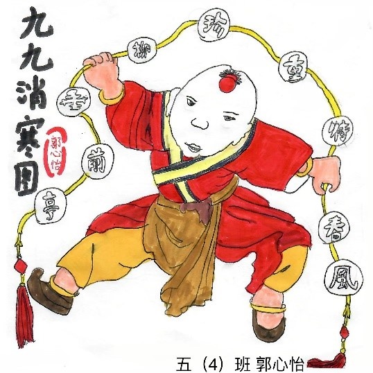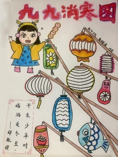 说到冬至节的习俗那一定少不了制作“九九消寒图”。孩子们化身为小画家创作着一幅幅精美的消寒图。梅花傲雪独立是冬日的精灵,孩子们热爱梅花将它融入消寒图的创作中,九朵梅花,八十一片花瓣,待花瓣全红便冬去春来,万物复苏。