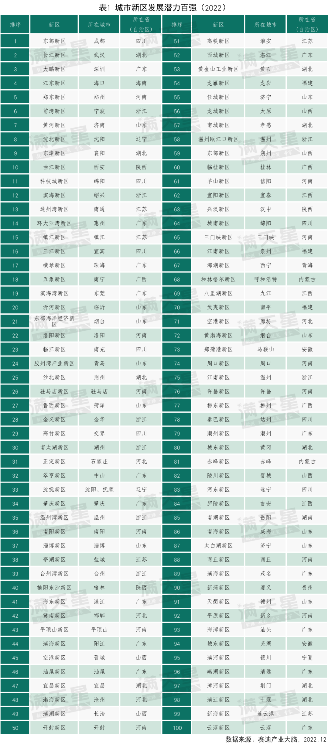 12月22日,赛迪顾问发布城市新区发展潜力百强(2022),成都东部新区、武汉长江新区、深圳大鹏新区位列前三甲。榜单显示,河南12个新区上榜,是全国上榜第2多的省份。其中,郑东新区上榜第5名、洛阳新区第22名、驻马店新区第26名、南阳新区第36名、平顶山新区第43名、开封新区第50名、羊山新区第61名、三门峡新区第65名、周口新区第74名、许昌新区第76名、商丘新区第88名、平原新区第92名。