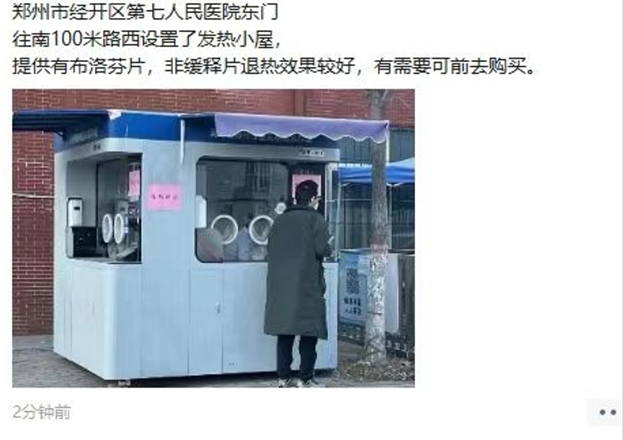 12月22日,郑州市第七人民医院门口的核酸小屋变成了发热门诊,向市民出售布洛芬片等退烧药,布洛芬片2元一板。据了解,该发热小屋门诊由医院设置,上午营业到中午12点,下午2点上班5点下班。小屋内有郑州市第七人民医院的大夫值班,对买药的市民进行问诊登记,根据病情销售布洛芬片、双黄连和抗病毒口服液,目前只有一个,主要是为了方便附近的居民就诊。