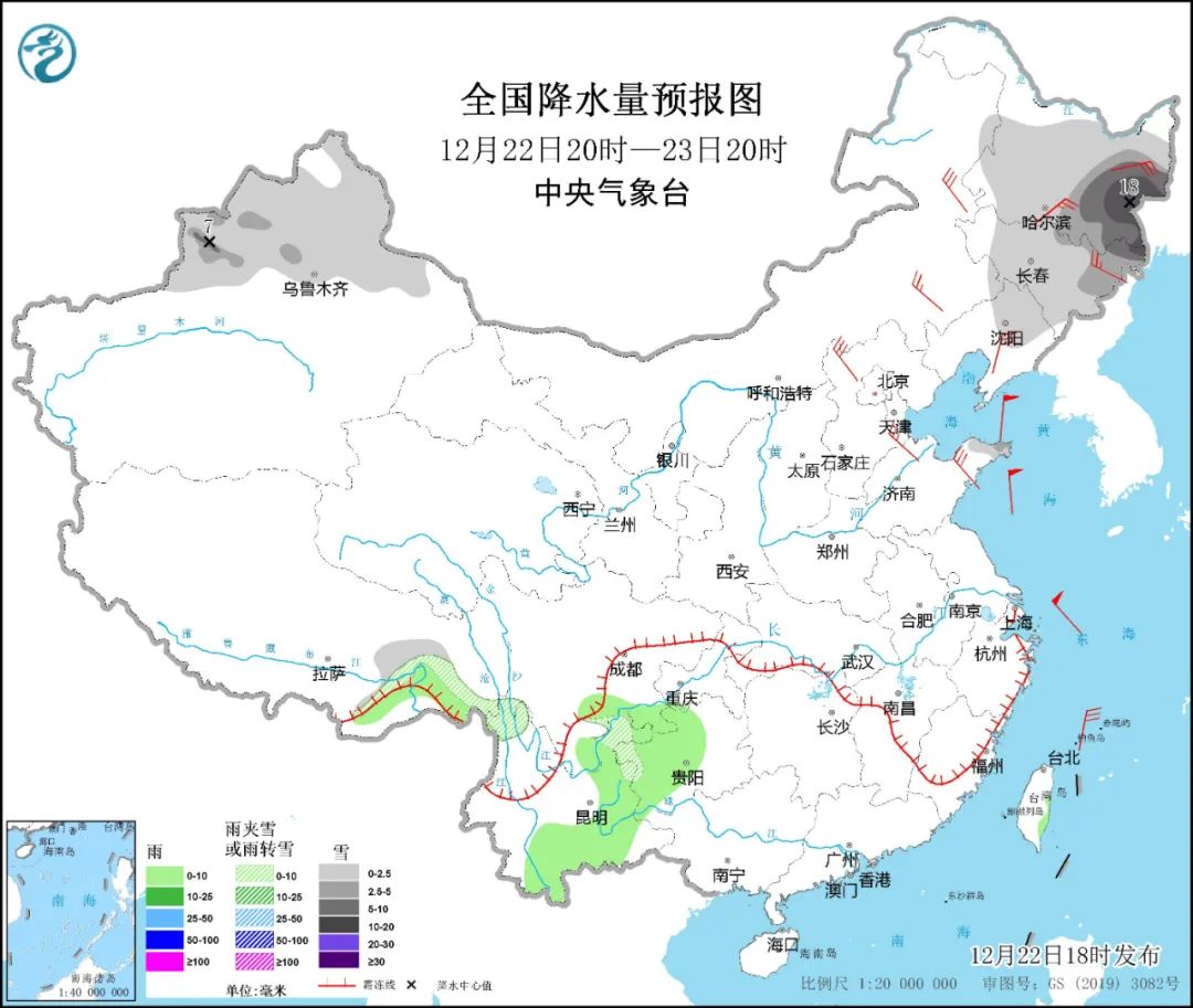 新疆北疆、东北地区中北部等地部分地区有小到中雪,其中,黑龙江东部、吉林东北部、新疆伊犁河谷等地部分地区有大到暴雪;云南中部、贵州西部、四川南部等地部分地区有小雨。