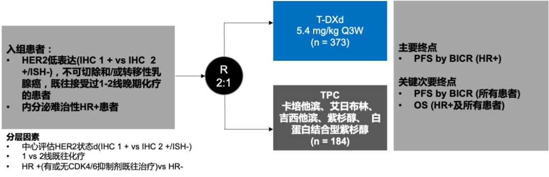 DESTINY-Breast04研究是一项在既往接受过1-2线化疗的且被确定为HER2低表达(如下图)(免疫组化 [IHC]1+或IHC 2+且原位杂交 [ISH]阴性)转移性乳腺癌患者中进行的随机、开放性、III期研究。患者以2:1的比例随机接受T-DXd或研究者选择的化疗(TPC)。肿瘤样本在中心实验室使用PATHWAY HER2 4B5检测,HER2评分由训练有素的病理医生根据2018 ASCO/CAP HER2检测指南中的判断标准确定,如果样本为IHC 2+,则使用INFORM HER2 Dual ISH DNA Probe Cocktail检测HER2扩增状态。