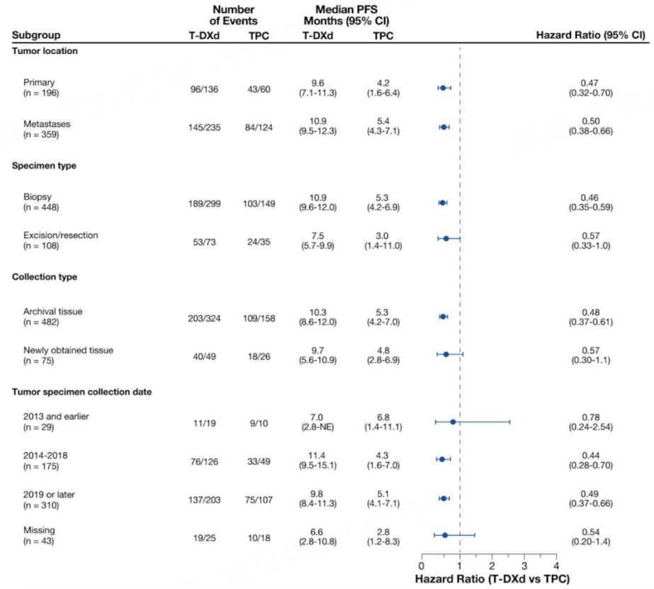 入组患者中,不管是来源于原发灶/转移灶、活检/手术切除、存档/新鲜采集组织、2014-2018/2019或之后采集的肿瘤样本,当其HER2评分为低表达,接受T-DXd治疗相比TPC组均有显著PFS获益,与总人群趋势一致。