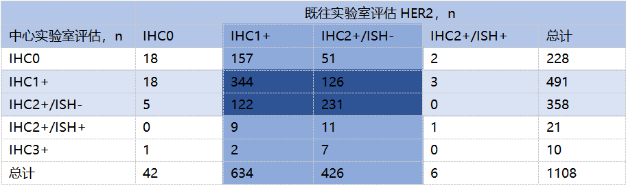 在提交肿瘤样本的1340例患者中,1108份样本同时具有既往(当地)和本次中心实验室 HER2 IHC检测结果;其中1060份样本根据既往(当地)检测结果被判读为HER2低表达(lHC 1+或IHC 2+/lSH-)。78%(823/1060) 根据既往(当地)检测结果被判读为HER2低表达的样本,经中心实验室检测后仍确认为HER2低表达。在22%(237/1060) 的不一致样本中,208/237(88%) 经中心实验室检测评分为IHC 0,29/237(12%) 经检测后评分为IHC2+/ISH+或IHC 3+。