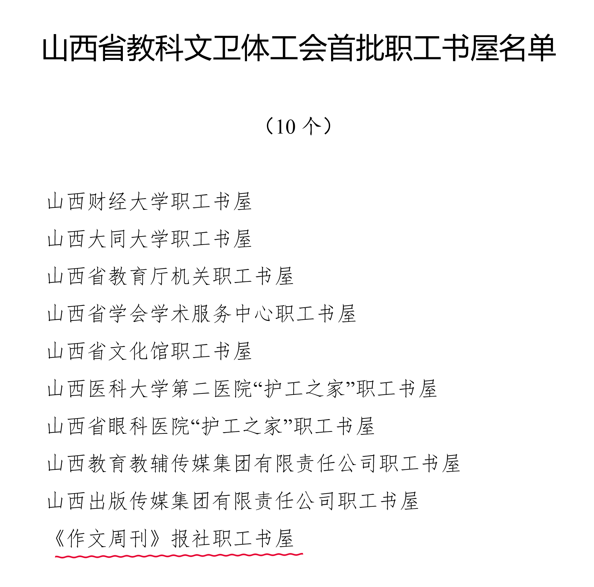 经过基层推荐、综合评估,共评选10 家单位的职工书屋为“山西省教科文卫体工会首批职工书屋”。我社榜上有名!