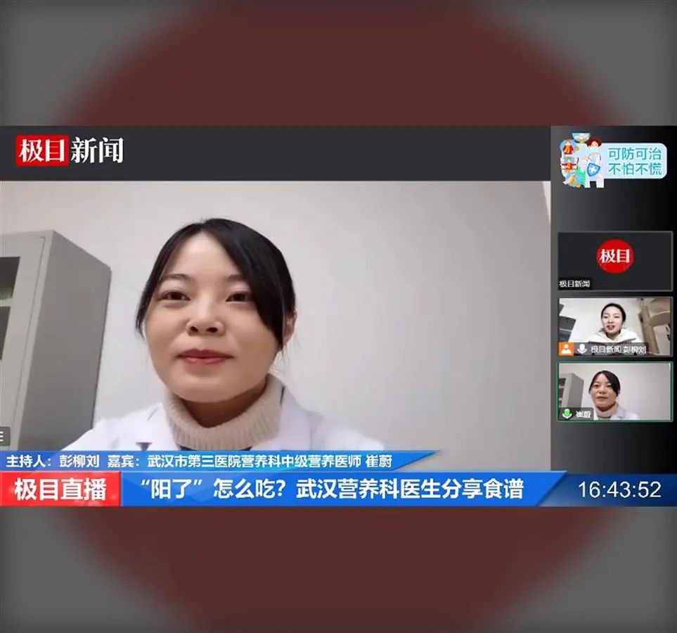 “阳了”后没胃口、“刀片嗓”只能吃稀饭?“阳了”后吃什么康复更快?12月22日下午4时30分,武汉市第三医院营养科中级营养医师崔蔚做客极目新闻直播间,分享饮食指南,在线分享美味食谱,10万余名网友在线收看了直播(点击回看直播)。