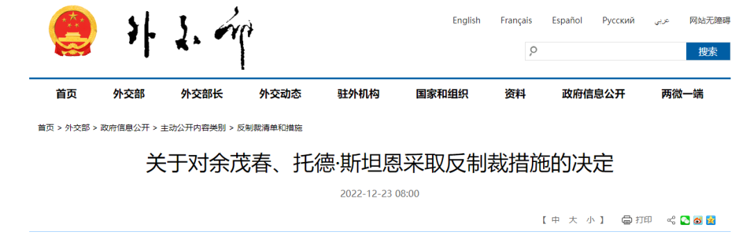 12月23日,中国外交部网站发布《关于对余茂春、托德·斯坦恩采取反制裁措施的决定》。