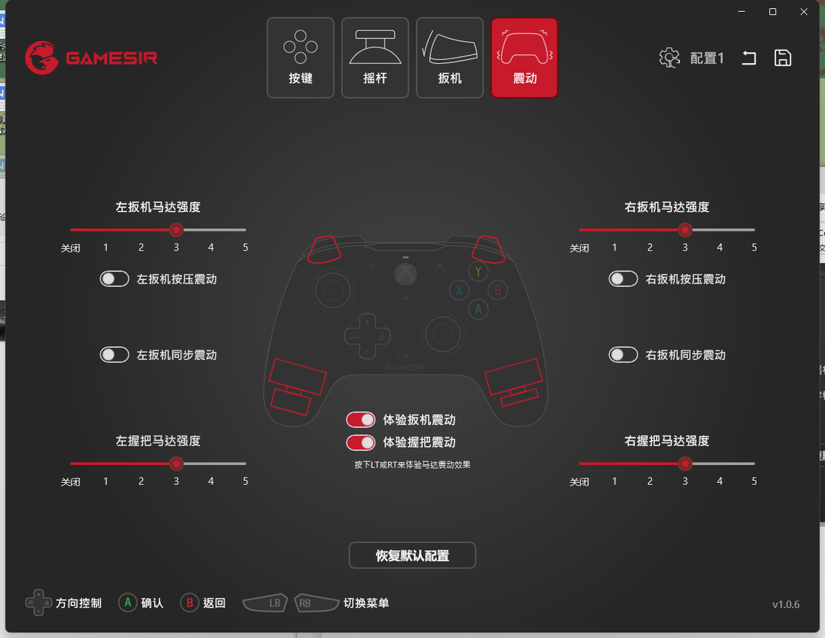 盖世小鸡GAMESIR-G7内置有4个震动马达,可以实现按压振动(仅扳机)和同步振动(握把和扳机)两种模式。由于有微软授权,只要是相应支持震动的游戏,无需进行设置。对于那些Xbox不支持震动的游戏,开启按压震动后,能根据你按下扳机键的深度,反馈对应的震动强度,震感更细腻。我在玩《极限竞速:地平线5》时,将设置了油门的右扳机开启了按压振动,相当于踩油门就会有震动的回馈,这体验实在是太真实了。自此基础上,盖世小鸡GAMESIR-G7增加了一个握把同步震动,在按下扳机震动的同时,握把也会跟着震起来。甚至我觉得震动强度太大,还不得不调低马达的强度。同时开启这个功能之后,在《极限竞速:地平线5》中遇到不同铺装路面时,可以明显感受到手柄的振动有了更多层次的丰富表现,让游戏体验更带感。