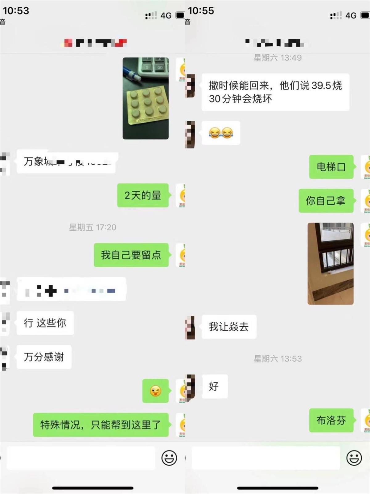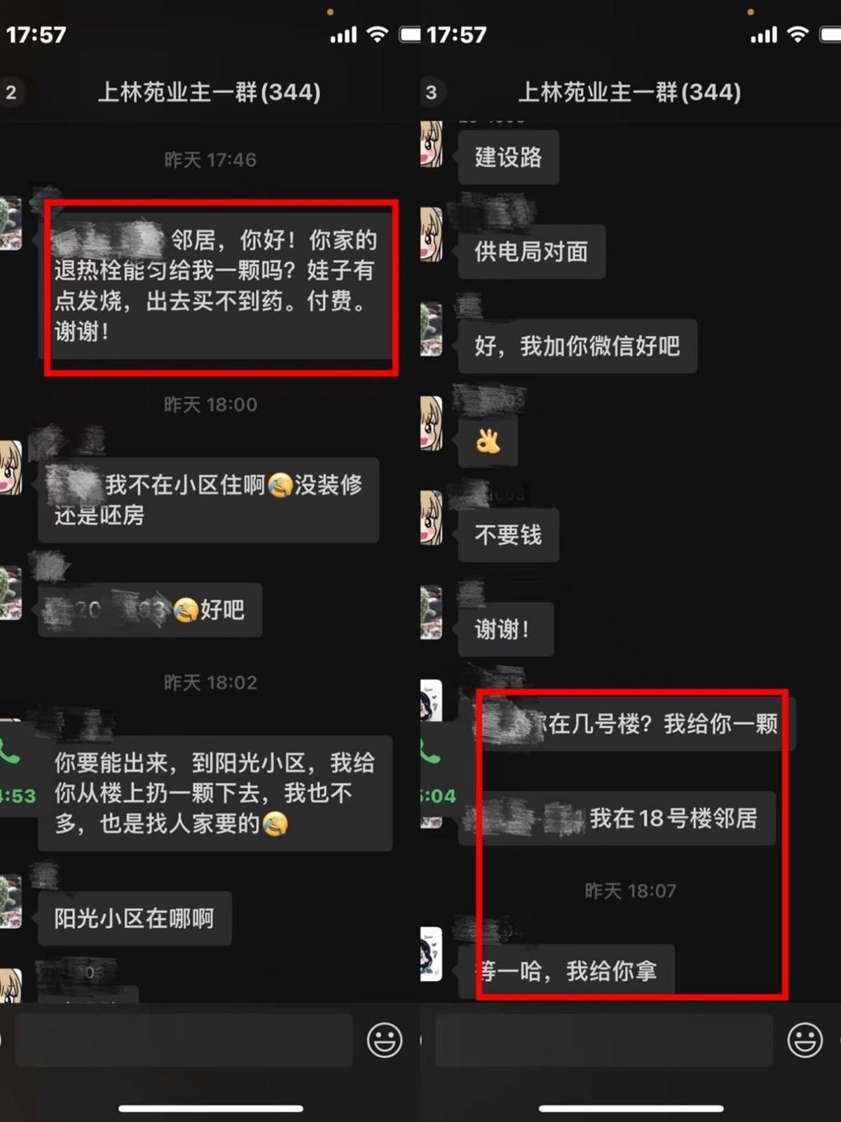 “亲们,我家住万象城10号楼,我的家人高烧39.5度,急需退烧药”……“我自己留点,给你2天的量”“已把布洛芬送电梯口,麻烦自己拿一下。”