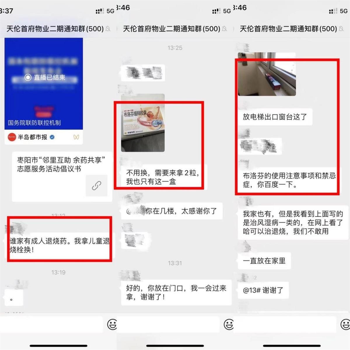 “谁家有成人退烧药?我拿儿童退烧栓换!”“不用换,需要来拿2粒,我也只有这一盒”“放电梯出口窗台这了”,并嘱咐道“布洛芬的使用注意事项和禁忌症,你百度一下”。这是发生在枣阳天伦首府小区群的暖人瞬间。