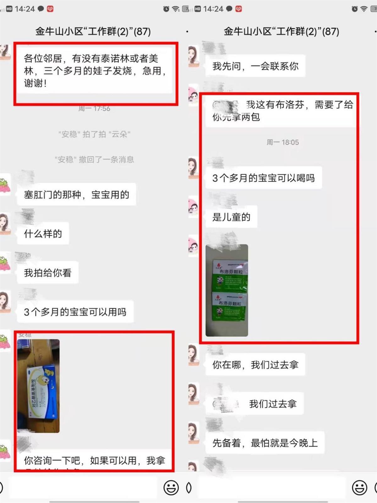 在金牛山还建小区,一位居民妈妈发出求助“各位邻居,有没有泰诺林或者美林,三个多月的娃子发烧,急用,谢谢!”,不一会儿,就收到多个邻居的回应“我有对乙酰胺基酚栓”“我这有布洛芬(儿童),需要了给你先拿两包”。