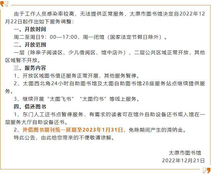 12月21日,太原市图书馆通知,由于工作人员感染率较高,无法提供正常服务,太原市图书馆决定自12月22日起,一层(除亲子阅读区、少儿借阅区、馆中店外)、二层公共区域正常开放,其他区域暂不开放。开放区域图书借还服务正常开展,其他服务暂停等。