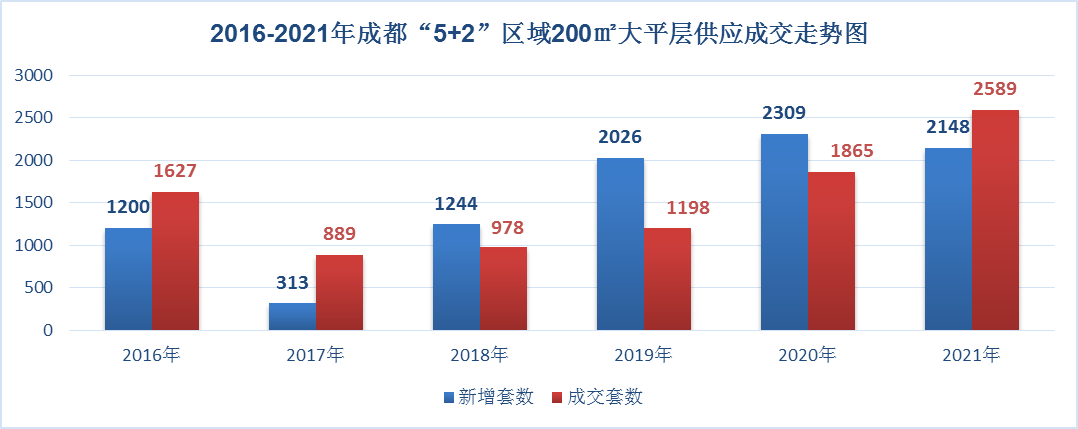 2016-2021年成都“5+2”区域200㎡大平层供应成交走势图