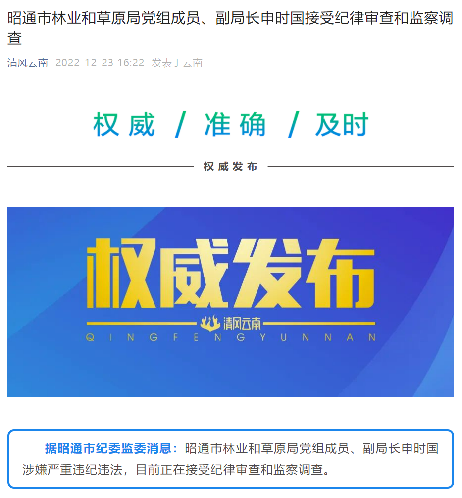 12月23日,据昭通市纪委监委消息:昭通市林业和草原局党组成员、副局长申时国涉嫌严重违纪违法,目前正在接受纪律审查和监察调查。