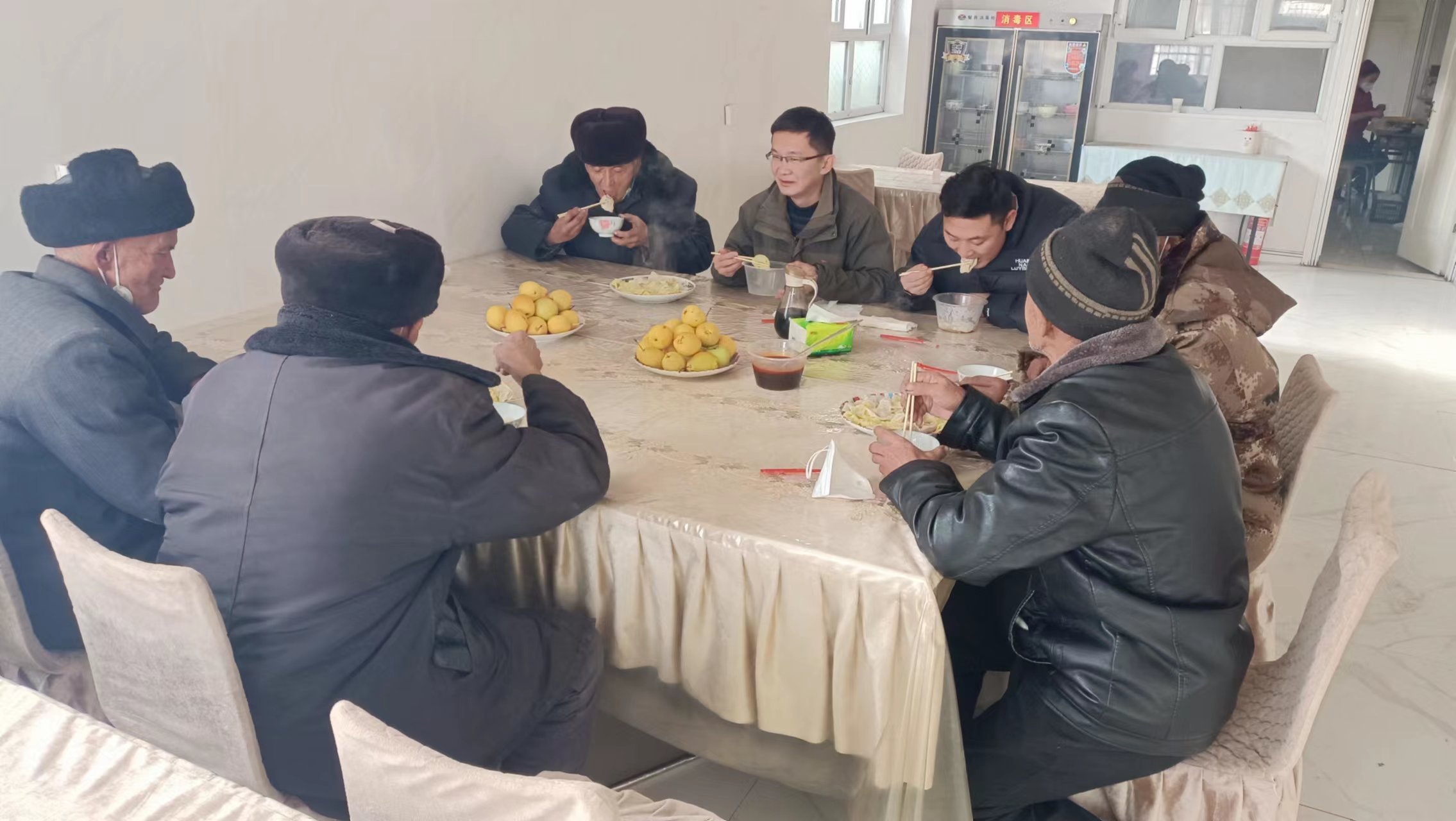 老人们来到其盖布拉克村养老助餐点,各族干部群众聚在此,所有人分工明确,你擀我包,你教我学,大家一起搓面粉、揪面团、调馅,擀皮子、包饺子,其乐融融。很快,一个个形状各异的饺子整齐地摆在了面板上,大家相互夸赞着谁的饺子包得漂亮,谁包得快,谁包得个大,一片欢声笑语。一碗碗热气腾腾的饺子端上餐桌,大家开心地拉着家常,一阵阵轻松惬意的欢声笑语从养老助餐点不断传出,现场弥漫着节日的氛围。