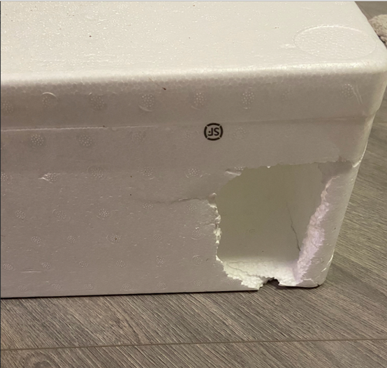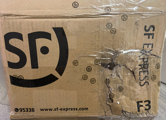 赵女士表示,泡沫箱被掏出了一个洞,外包装也有破损,破损处用顺丰胶带重新粘贴了。