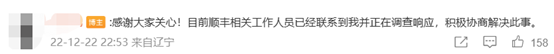 随后,当事人在该微博下留言道:感谢大家关心!目前顺丰相关工作人员已经联系到我并正在调查响应,积极协商解决此事。