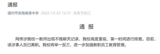 23日中午,温州市滨海高级中学针对此事发布通报:网传涉我校一教师出现不雅聊天记录,我校高度重视,第一时间进行排查。目前,该涉事人员已离职。我校将举一反三,进一步加强教职员工教育管理。