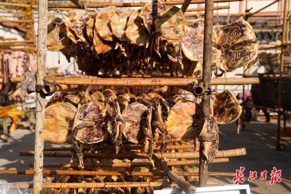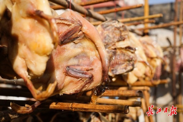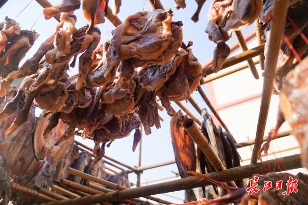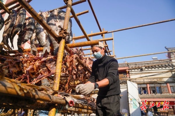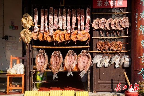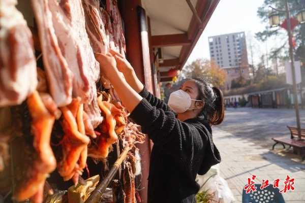 长江日报大武汉客户端12月23日讯 12月23日,腊月初一。武汉市东西湖区柏泉街茅庙集的一家开了三十多年的腊货商行鲢鱼坊的货架上挂满了各色腊货,一排排腊鱼、腊猪排、腊鸭在阳光下发出金灿灿的油光。一位张姓顾客一口气买了10条腊鱼,他说“每年这个时候,都会采购一些回去准备过年”。(长江日报记者彭年 摄影报道)