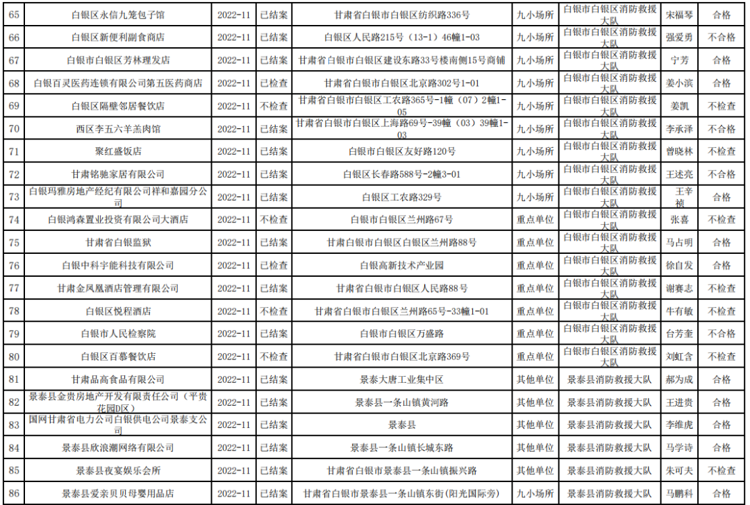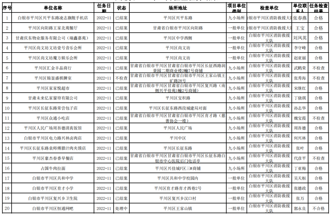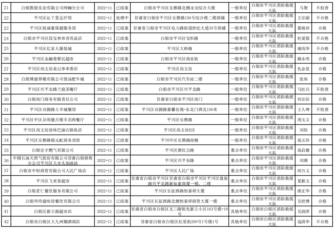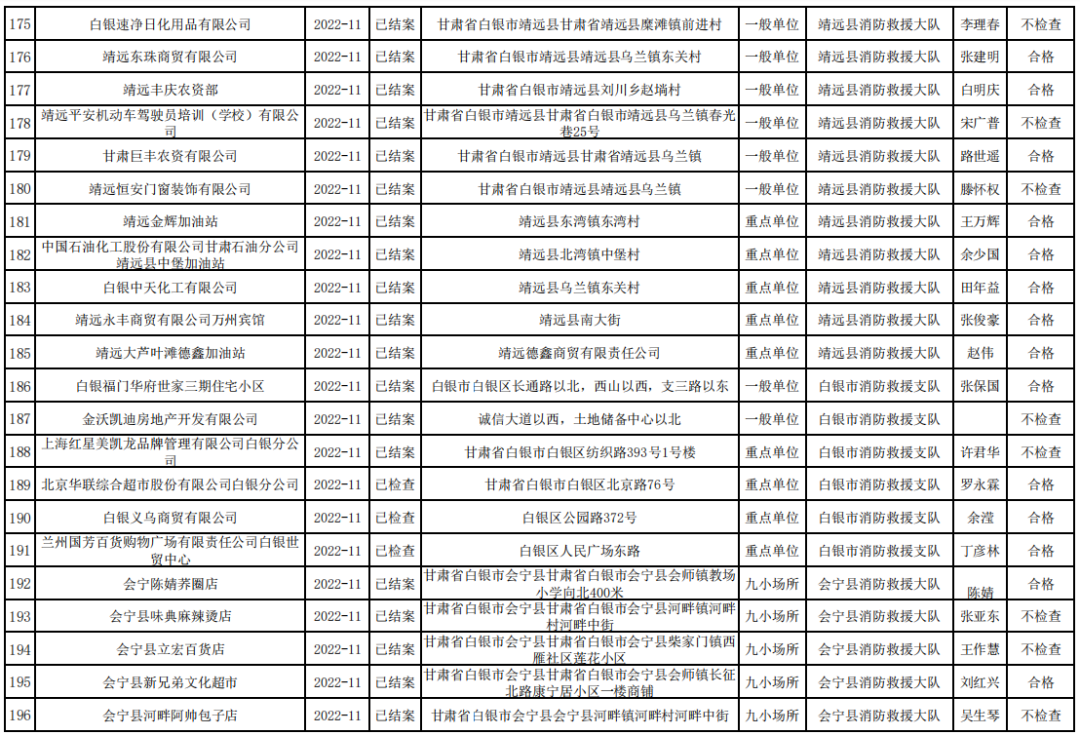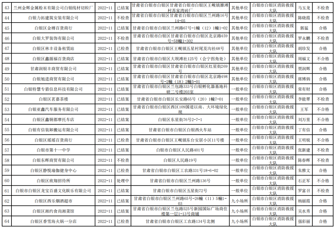 根据应急管理部消防救援局《关于全面推行“双随机、一公开”消防监管工作的通知》(应急消〔2019〕241号)及省消防救援总队《全面推行“双随机、一公开”消防监管工作方案》的要求,白银市消防救援支队从2019年10月1日起全面推行“双随机、一公开”消防监管工作模式。根据《甘肃省消防救援机构“双随机、一公开”消防监管工作实施细则(试行)》要求,现将2022年11月份“双随机、一公开”消防监督检查对象检查结果公示如下,请社会各界予以监督。