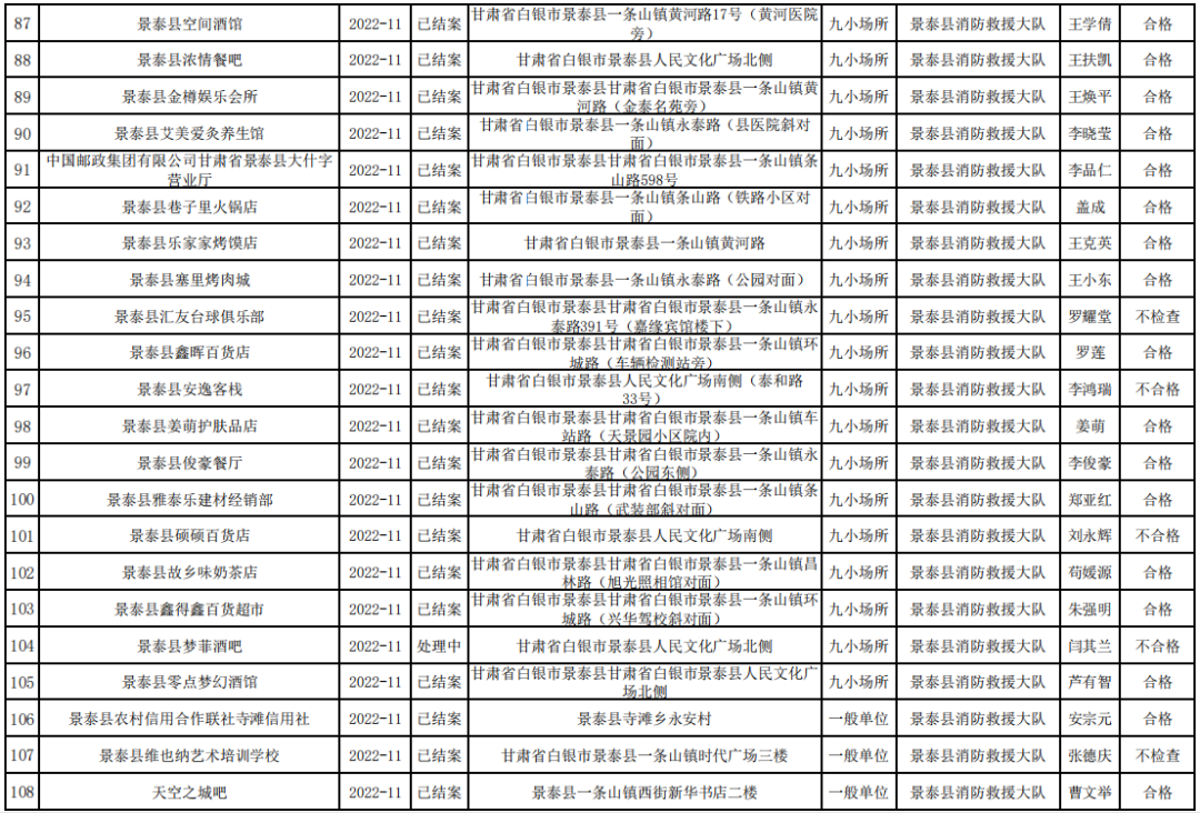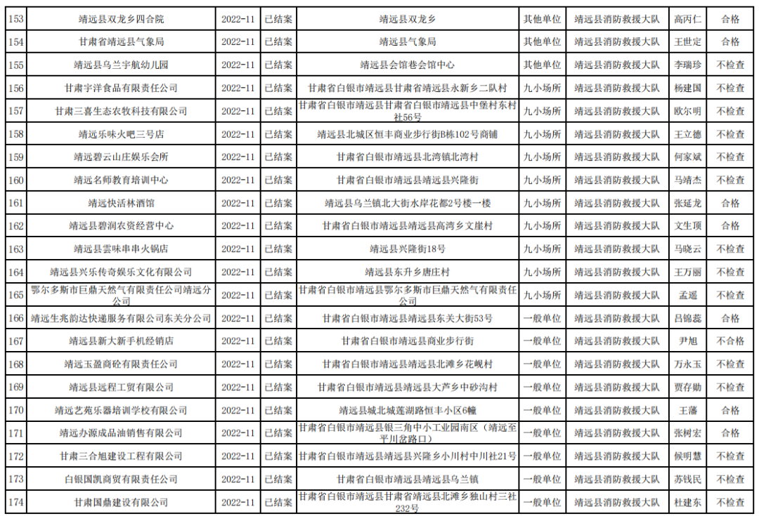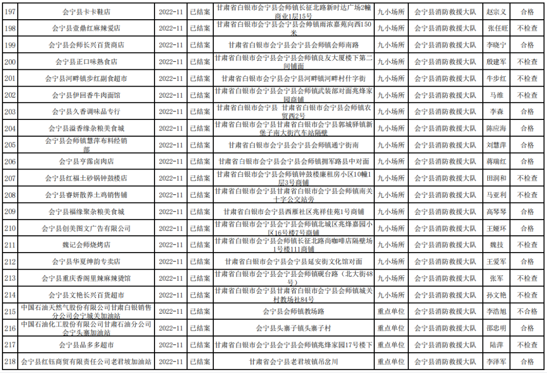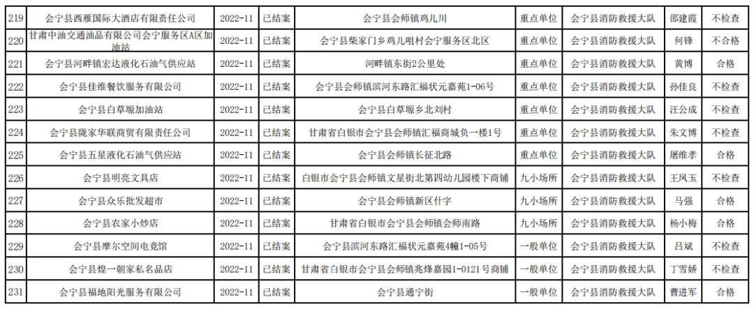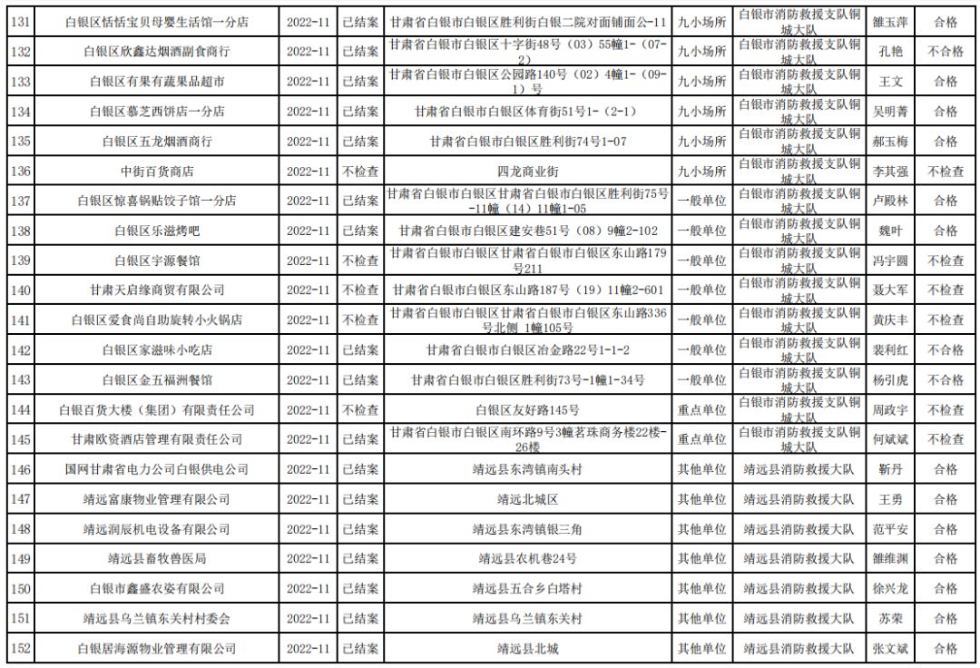 根据应急管理部消防救援局《关于全面推行“双随机、一公开”消防监管工作的通知》(应急消〔2019〕241号)及省消防救援总队《全面推行“双随机、一公开”消防监管工作方案》的要求,白银市消防救援支队从2019年10月1日起全面推行“双随机、一公开”消防监管工作模式。根据《甘肃省消防救援机构“双随机、一公开”消防监管工作实施细则(试行)》要求,现将2022年11月份“双随机、一公开”消防监督检查对象检查结果公示如下,请社会各界予以监督。