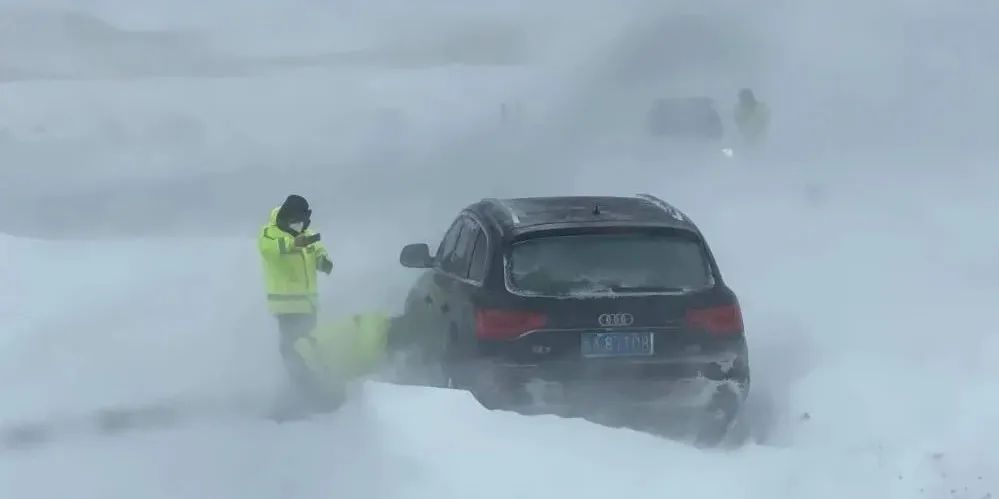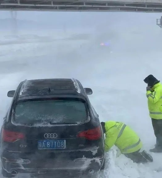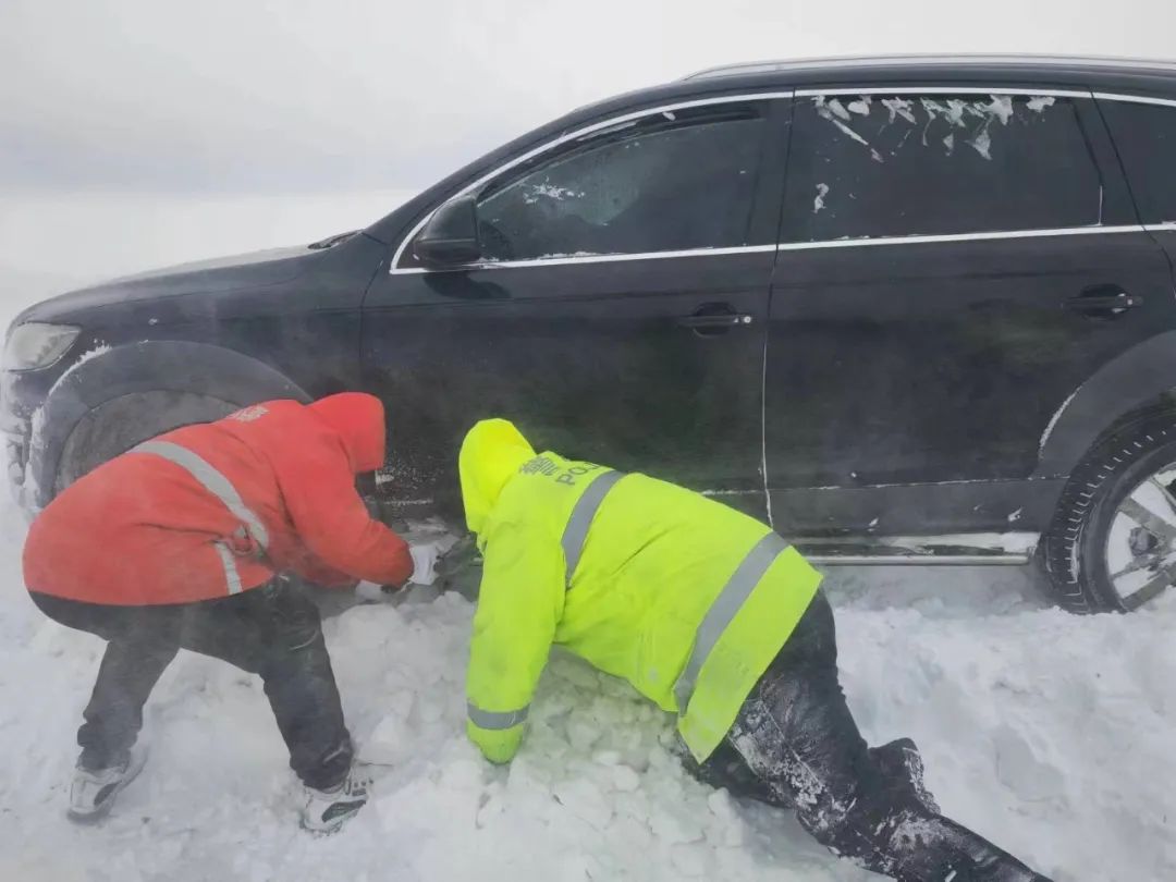 执勤民警立即赶赴现场,同时联系公路局工作人员到达现场。由于风吹雪恶劣天气的影响,道路能见度很低,部分路段形成雪梁,救援力量利用铲车、警车、拖车绳等一系列救援装备,通过人工铲雪、人工推车等方式展开救援。