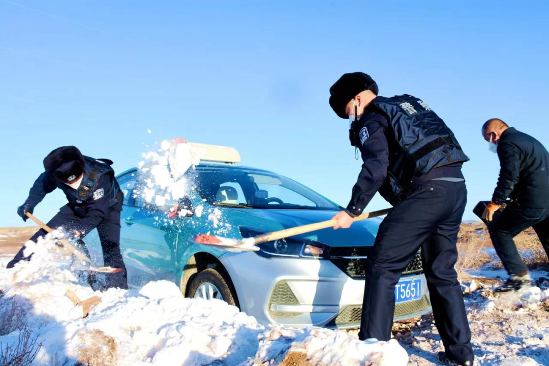 12月21日16时30分,新疆出入境边防检查总站哈密边境管理支队二红山边境派出所接到求助,称车辆被困戈壁滩的积雪中无法行驶,请求救援。