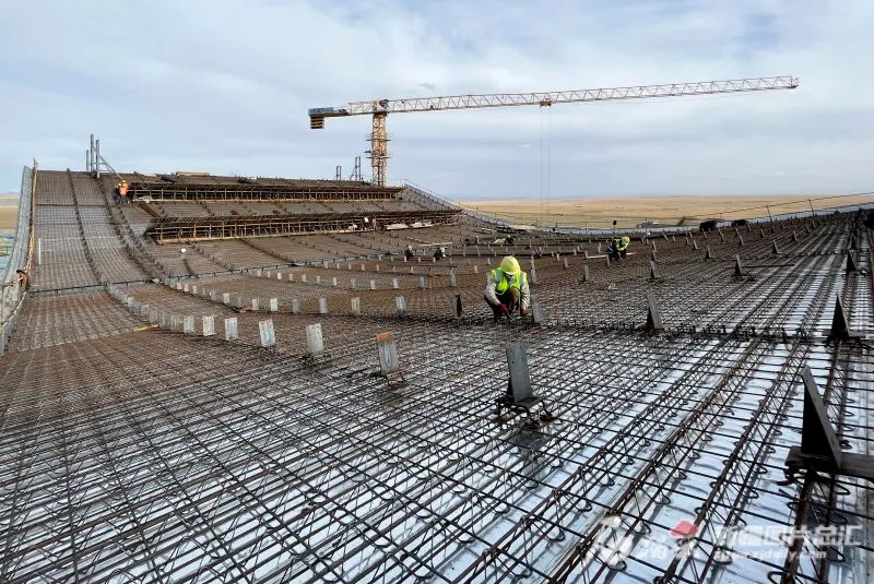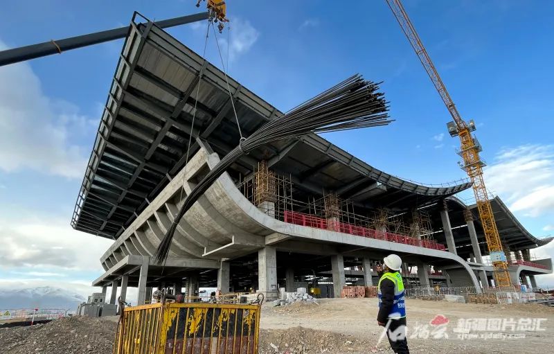 10月8日,巴音布鲁克机场航站楼建设现场,中建三局工作人员在有序施工。李雯 摄