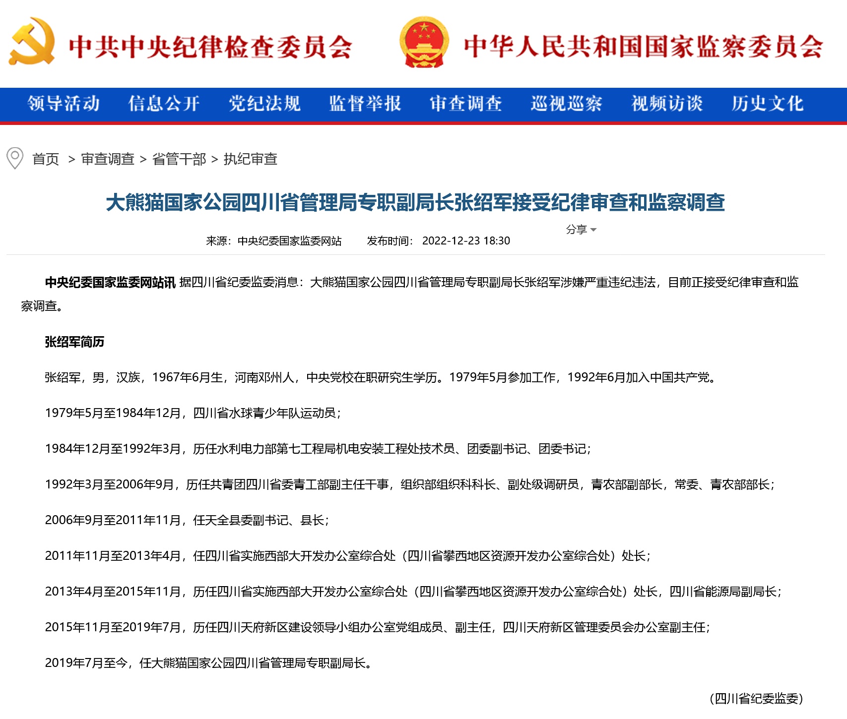 12月23日,中央纪委国家监委网站讯,据四川省纪委监委消息:大熊猫国家公园四川省管理局专职副局长张绍军涉嫌严重违纪违法,目前正接受纪律审查和监察调查。