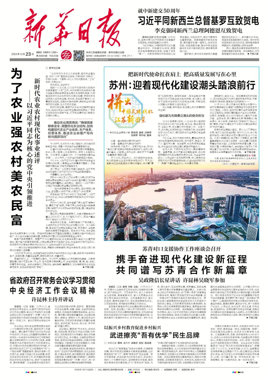 敢为人先、主动作为是苏州一贯的精神内核。省委常委、苏州市委书记曹路宝说,苏州牢牢把握新时代新征程党的使命任务,全面落实党的二十大作出的一系列战略部署,奋力推动中国式现代化在苏州的生动实践,在全国全省现代化“一盘棋”中展现担当作为、作出更大贡献。
