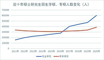 在相关政策的推动下,硕士研究生招生总人数中,专硕招生人数增长明显。2017年起,专硕招生人数突破40万,首次超过学硕招生人数。到2020年专硕招生人数超过60万人,并与学硕招生人数之间差距逐渐拉大。