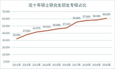 近十年硕士研究生招生中,专硕占比逐年提升,2020年占比超过60%。