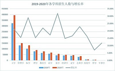 2020年研究生招生总量较上一年增长20.73%。从各学科增长率方面看,农学是增长率最高的学科,达到了31.85%。其次是医学,招生人数增长率达到了29%。