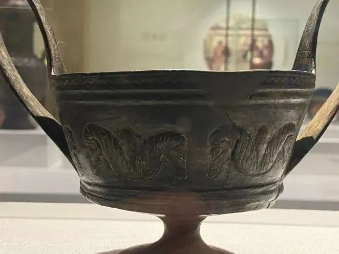 许多布凯罗黑陶都有一圈水平饰带,那是用一根圆筒碾压黏土留下的花纹。大家可以在展品中找一找。下面的杯沿处有着非常明显的纹饰,这也是伊特鲁里亚的制陶特色。