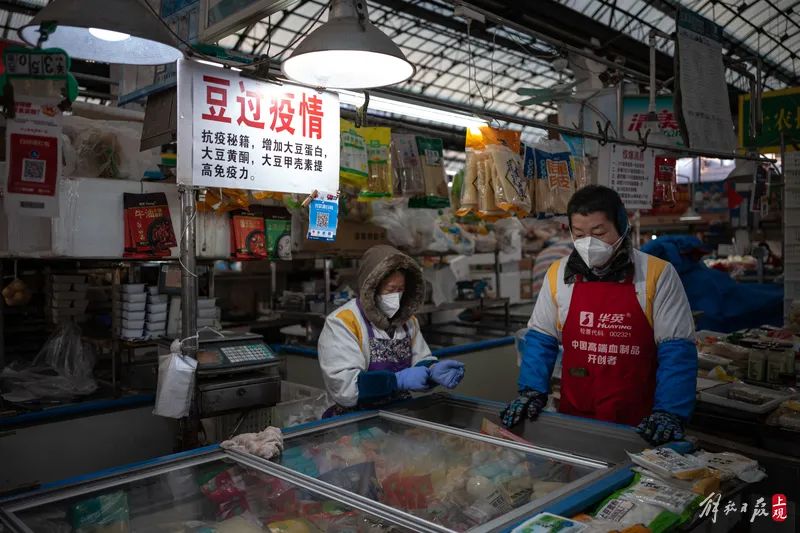 来自苏北的老潘和太太经营着一个豆制品摊位。老潘在自己的摊位上挂出招牌,上书“豆过疫情”。对于健康,老潘有自己的一套理论:“用的是有机大豆而不是转基因大豆,产品的风味才好,营养价值也高,消费者吃了我们的产品,抵抗力上去了,就不怕病毒。”