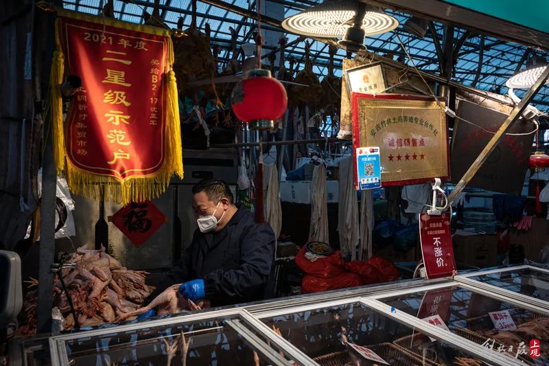 年届五十的上海爷叔沈亚军在市场经营着一个贩售安吉竹林走地鸡的摊位。老沈说,名字叫亚军,就是不争第一名,但要把自己的生意做好,以自己优质的产品,低廉的价格,在老百姓中间树立起一个亚军的口碑。最近,他在隔壁图文店打印了一张颜色喜庆的招牌,上书“本摊位疫情期间不涨价”。