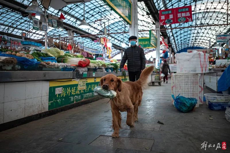 上钢集贸市场对宠物友好,甚至可以看到狗狗帮着主人叼上一把葱招摇过市。
