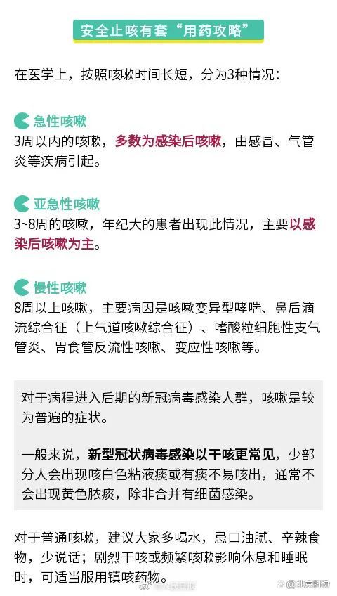 据人民日报微博,航空总医院呼吸与危重症医学科主任医师窦志芳、首都医科大学附属北京朝阳医院副主任医师伍燕兵对咳嗽的不同情况进行了科普,并给出了安全止咳攻略: