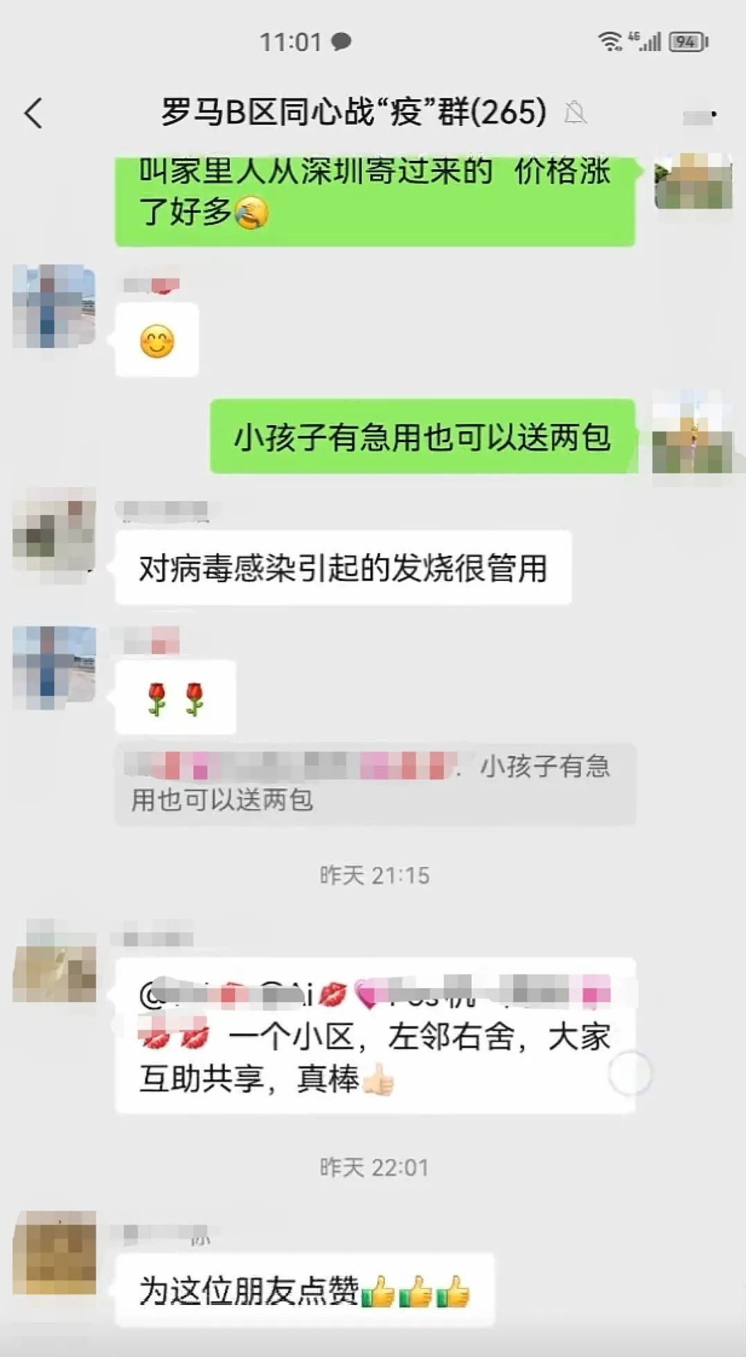 “如果有急用,我可以送两包。”居民周女士主动分享退烧药信息,刚好帮一位邻居救了急。这是出现在罗源罗马景城B区战“疫”群里的温馨一幕。原是为通知做核酸、筑牢疫情防控网而创建的“同心战疫群”,如今变成了“邻里药品交流群”。