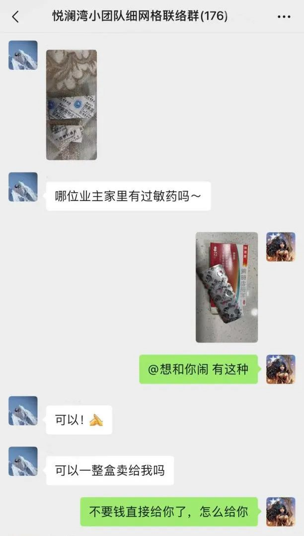 “哪位业主家里有氯雷他定这类的抗过敏药?”19日下午2点半,悦澜湾小区业主王先生在微信群发出求助信息。不一会儿,就有热心业主回应,表示免费赠药。楼长以及社区志愿者第一时间开展传递行动,不到半小时,药物便顺利送到王先生的家中。