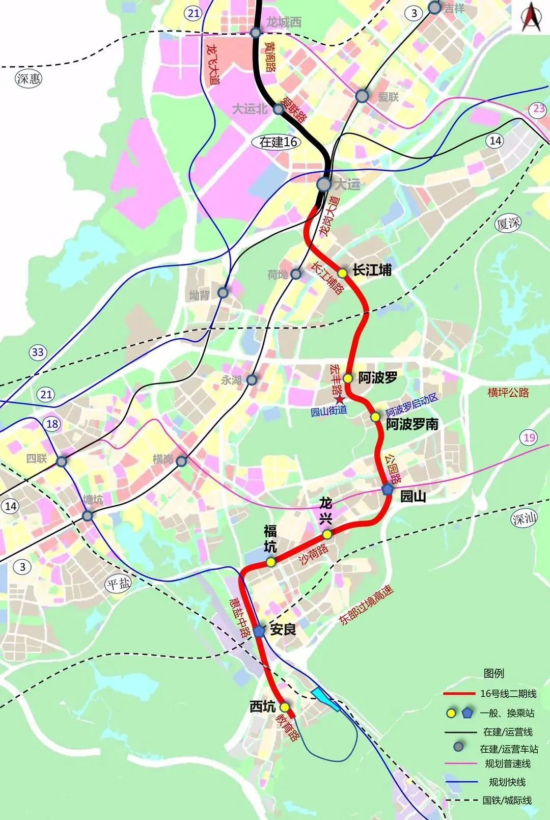 地铁16号线二期线路由16号线一期工程起点大运站引出,沿龙岗大道、长江埔路、万福路、公园路、沙荷路、惠盐中路敷设,终至西坑站。