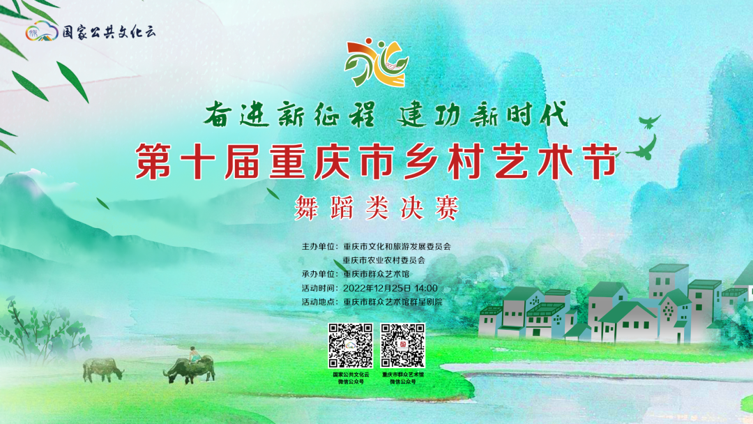2022年12月25日,“奋进新征程 建功新时代”——第十届重庆市乡村艺术节(舞蹈类)决赛即将在重庆市群众艺术馆群星剧院重磅开赛,国家公共文化云将为您全程直播,敬请期待!