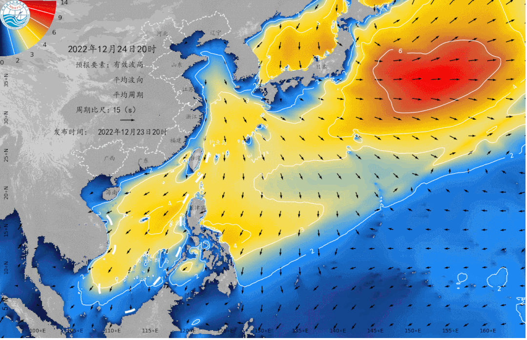 (1) 受强冷空气影响,预计24日至25日,黄海将出现3~5米的大浪到巨浪区,东海、台湾海峡海域将出现3~5米的大浪到巨浪区,南海将出现3~5米的大浪到巨浪区。