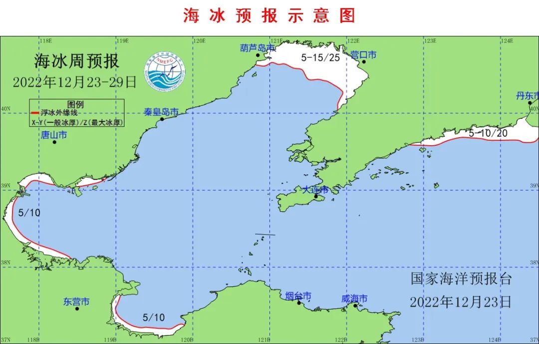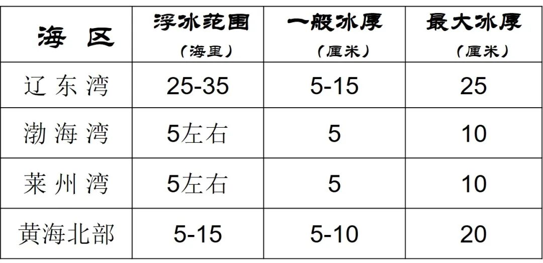 预计未来一周辽东湾最大浮冰范围25~35海里,一般冰厚5~15厘米,最大冰厚25厘米;渤海湾、莱州湾浮冰范围5海里左右,一般冰厚5厘米左右;黄海北部浮冰范围5~15海里,一般冰厚5~10厘米,最大冰厚20厘米。
