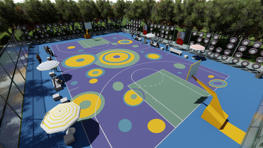 当“美丽宜居乡村篮球场”化身为“央数藏”数字藏品,人们也能更加清晰地感知到青年设计师们对于美丽乡村和乡村体育发展的思考。在《“圆”梦》设计作品中,来自大连工业大学风景园林专业的石韫嘉通过对乡村人居环境的分析和研究,针对生态宜居乡村的需求,从人出发、以人为本,合理利用空间最大化地提升整体设计。在她的作品中, 乡村的空旷与阔达,如同海面一般,自由奔腾的海浪划出一道道弧线,和篮球场上的圆弧呼应着,而圆形也恰好成为表达这幅作品的最佳元素,它代表了对梦想的保护、对未来的无限渴望以及无限的力量,也代表了运动中每一个优美的弧线。蓝色的背景既是乡村湛蓝的天空,也是无拘无束的海洋,用不同颜色的圆来代表绿地、麦田、水,把乡村的元素抽象化提取出来,错落有致地排布在画面当中,和谐而舒适。而颜色的参考则更具考量,同梵高的《星空》一样,代表了每一个来自乡村、生活在乡村的人追寻梦想的内心。她希望能够将《“圆”梦》呈现在村落的空旷休息区或者校园中,用年轻人的色彩和表达为乡村带来更多活力、自由的元素。